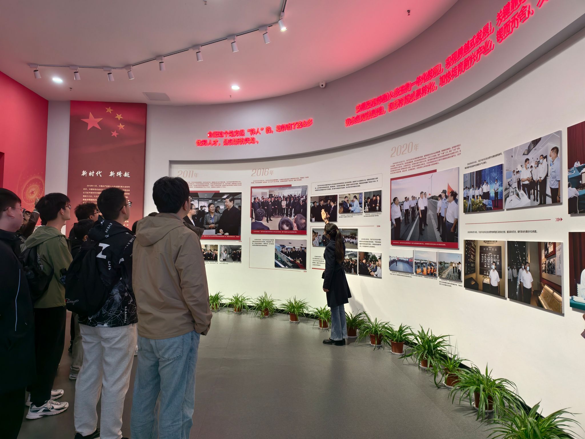 中国共产党合肥历史馆是合肥市首个全党史脉络红色历史场馆。馆内充分运用多种展陈形式,展示了包括崔筱斋、蔡晓舟在内的110位重要人物;呈现了北乡支部创建、双河集农民暴动等20多件重要事件;用大幅空间全景展现了习近平总书记3次视察合肥的情景。展馆内的每一幅画卷、每一件文物都见证了中共合肥地方党组织的建立、成长和壮大,反映了在党组织的带领下合肥人民踔厉奋发、砥砺前行的拼搏精神。在参观过程中,同学们全神贯注,仔细思考着每一个事件背后的意义,眼神中充满了对党的敬仰和对历史的敬畏。