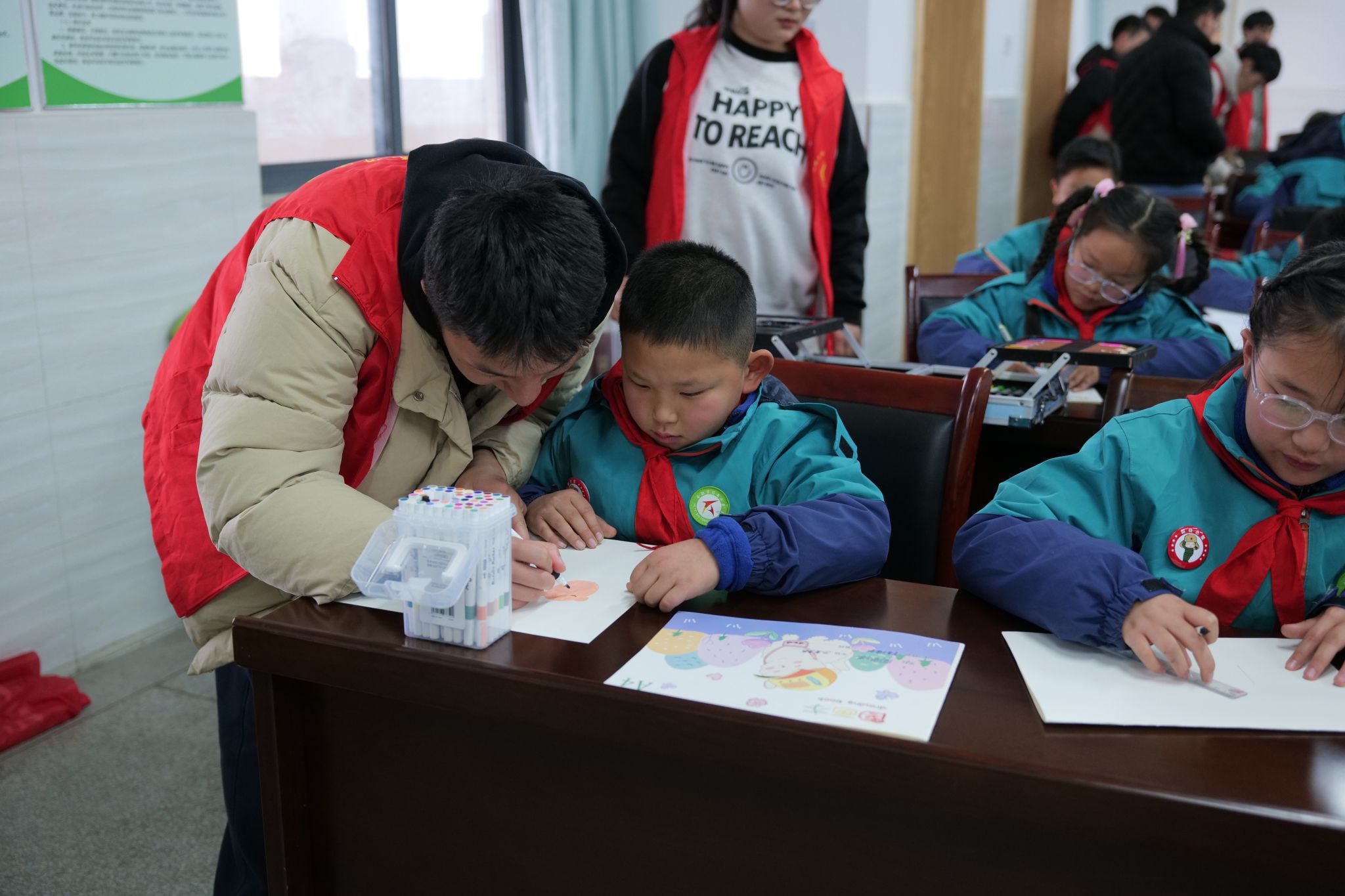 活动在“歌声传爱心” 音乐课堂中拉开帷幕,志愿者们通过领唱、分句教唱等方式,带领孩子们用稚嫩的童声演绎《学习雷锋好榜样》。随后的科学小课堂中,志愿者们向小朋友们讲述了钱学森、袁隆平等奉献精神攻克难题的故事,通过知识问答的方式活跃氛围,加深孩子们对“科学家精神”的认识;而后志愿者们又化身 “科普讲师”,通过 “叶片轮船”、“智力赛车” 等趣味项目,引导孩子们在动手实践中亲身感受科学魅力。最后,在绘画创作环节,孩子们围绕 “我心中的雷锋”展开想象,用彩笔描绘出 “红旗下敬礼的雷锋”等场景,完成 50 余幅充满童真的作品。