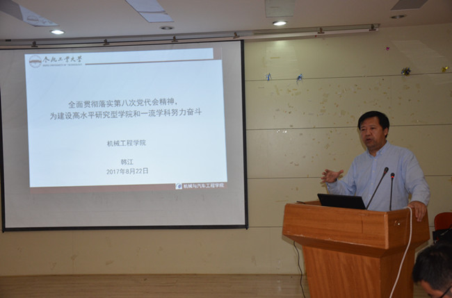 最后,院党委书记韩江发表了讲话,他作了题为《全面贯彻落实第八次党代会精神,为建设高水平研究型学院和一流学科努力奋斗》的报告。他首先带领与会人员重温了校第八次党代会的主要内容和重要精神,然后从全面加强党的建设、确保学院各项事业持续健康发展和依托学院实际、培育和强化特色、落实六大发展任务两个大的方面,就学院如何贯彻落实第八次党代会精神的措施方案进行了的阐述。并详细解读了我院的“三步走”战略,力争在建校100周年之际,机械工程学科进入世界一流学科前列,实现国际知名的研究型高水平学院建设目标。
