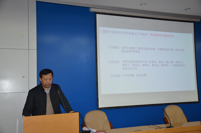 韩江书记代表学院党委做《学院书记抓基层党建工作》汇报,从履行党风廉政建设、加强领导班子与干部队伍建设、抓好基层组织建设、深入开展“两学一做”学习、做好思想政治工作、重视统一战线工作、充分发挥工会、二级教代会作用、做好离退休人员和关心下一代等方面汇报了学院党委2016年党建与思想政治工作情况。