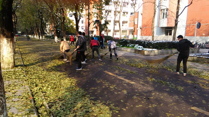 数九寒天,北风凛冽,来自各个支部的学生党员和志愿者在严寒中用简单的工具清扫路面上、草坪中、树丛里的落叶。由于雨雪天气,很多落叶夹杂着冰雪冻结在地面上,给清扫工作带来不小的挑战。同学们将清扫好的落叶聚拢成堆,转移到不妨碍大家出行的地方。挥舞的工具与忙碌的身影一道成为初冬校园中一道亮丽的风景线,经过同学们整个下午的辛勤劳动,校园再度焕发出整洁有序的勃勃生气。虽然参与劳动的同学都汗流浃背,但是他们却丝毫没有在意。看着干净的路面,得到在场师生和环卫工人的肯定,每一位同学的脸上都露出了欣慰的笑容。