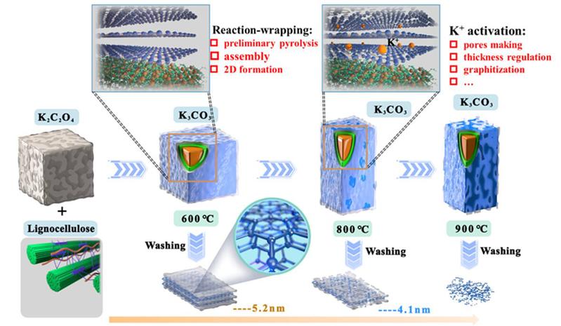 在能源战略转型背景下,发展可再生洁净能源和高效储能装置对“双碳”目标的实现具有重要意义。近日,yL23411永利官网登录yL23411永利官网登录生物质低碳技术与装备研究所马培勇教授团队,利用来源广泛的农林生物质与草酸钾在氮气氛围下直接共热解,成功制备出比表面积高、孔隙结构发达、碳层厚度可调的超薄二维多孔碳材料,在电化学储能方面展现出了极大的潜力。研究发现草酸钾在热解过程中首先作为反应物参与生物质热解反应,其分解产物碳酸钾则作为原位模板剂和活化剂。碳酸钾通过活化外层碳结构形成纳米孔,并调节碳材料的厚度和石墨化程度。此外,研究发现在载气中添加0.2 vol% NH3,可以在不破坏超薄二维结构的情况下,实现N原子掺杂并提高材料比表面积(1802 m2 g−1)。作为钠离子电容器的正极,该材料表现出优异的电化学性能,特别是在0.1 A g-1 ~ 2 A g-1的情况下,其容量保持率高达90.3%。二维多孔结构、高比表面积和丰富的吡啶-N含量显著增强了离子的传递和储存,优化了载流子的吸附和解吸。本研究可为开发低成本、绿色环保的二维多孔碳材料提供有益的参考。