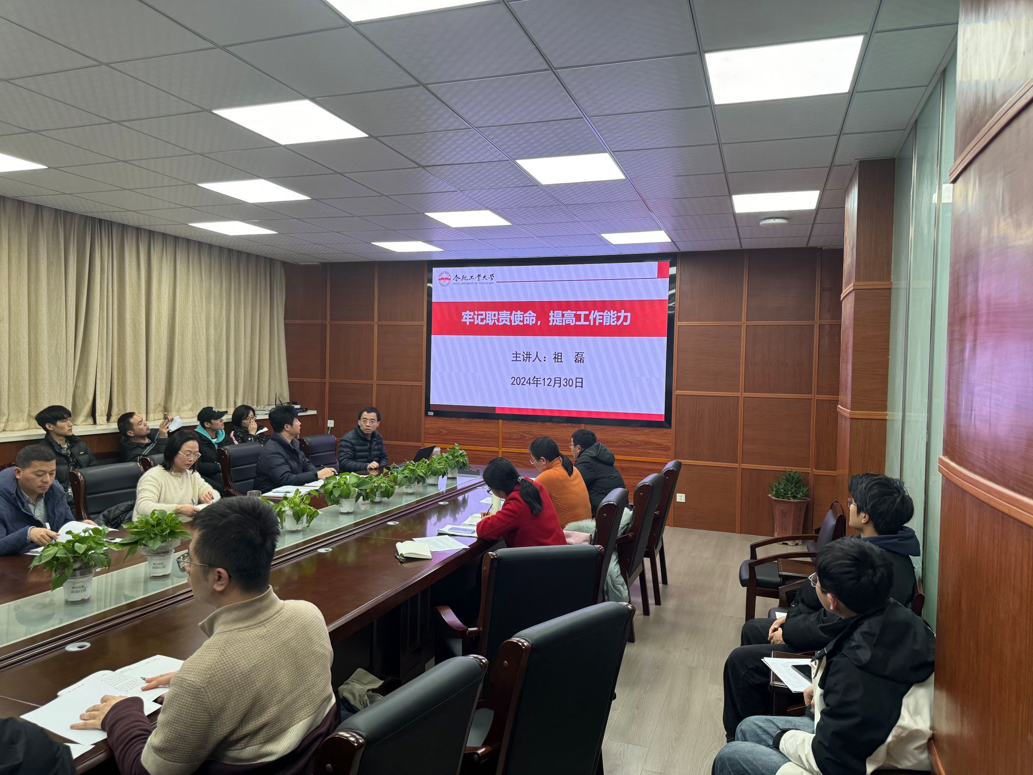 12月30日下午,yL23411永利官网登录党委书记祖磊为师生党支部书记讲授党课,党课题目为“牢记职责使命 提高工作能力”,学院党委秘书、研究生辅导员和28个基层党支部书记参加了党课学习。