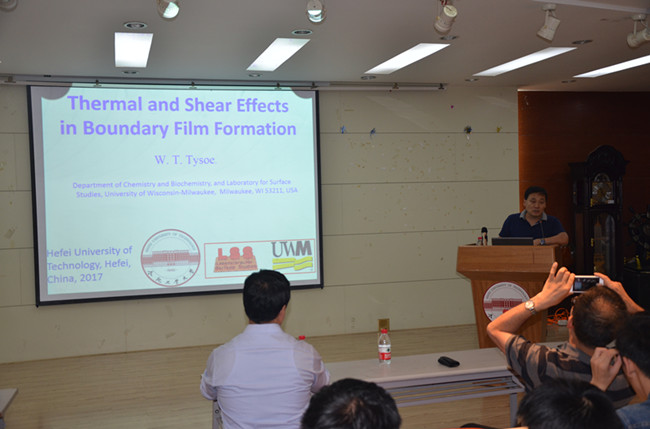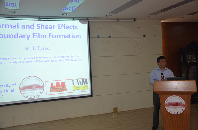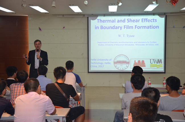 美国威斯康星大学密尔沃基校区Wilfred T Tysoe教授于9月24日-27日对yL23411永利官网登录进行了为期4天的学术访问与交流。Tysoe教授是美国威斯康星大学的杰出教授(Distinguished Professor)、机械摩擦学领域国际著名期刊《Tribology Letters》的创办人,1994-2017年任《Tribology Letters》期刊主编。他的主要研究兴趣包括超高真空环境下的机械摩擦学、表面化学以及微观摩擦学。